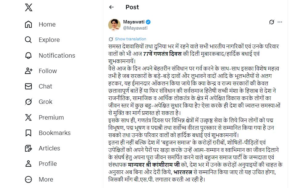 मायावती ने लिखा, “देश के सभी लोगों और दुनिया भर में रह रहे भारतीयों व उनके परिवारों को 77वें गणतंत्र दिवस की हार्दिक बधाई और शुभकामनाएं।” उन्होंने जोर देकर कहा कि संविधान पर गर्व तभी सार्थक है, जब सरकारों के दावों और वादों से हटकर ईमानदारी से मूल्यांकन किया जाए कि क्या वाकई लोगों के जीवन स्तर में अपेक्षित सुधार हुआ है? उन्होंने आगे कहा, “क्या केंद्र एवं राज्य सरकारों की बातें केवल छलावा हैं या संविधान की सर्व समाज हितैषी सच्ची मंशा के हिसाब से देश ने अपेक्षित विकास किया है?”