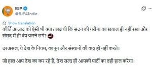 बुधवार को BJP के आईटी सेल प्रमुख अमित मालवीय ने सोशल मीडिया पर एक वीडियो साझा किया, जिसमें कीर्ति आजाद को सदन में हथेली में कुछ छिपाकर मुंह की ओर ले जाते हुए दिखाया गया है। मालवीय ने पोस्ट में लिखा, “अनुराग ठाकुर द्वारा आरोपित TMC सांसद कीर्ति आजाद हैं। उनके जैसे लोगों के लिए नियम-कानून का कोई महत्व नहीं। सदन में ई-सिगरेट छिपाकर रखना कितनी बड़ी गुस्ताखी है! धूम्रपान अवैध न हो, लेकिन संसद में इसका उपयोग अस्वीकार्य है। ममता बनर्जी को अपने सांसद के दुर्व्यवहार पर स्पष्टीकरण देना चाहिए।”