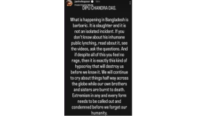 बॉलीवुड अभिनेत्री जान्हवी कपूर ने बांग्लादेश में हिंदू युवक दीपू चंद्र दास की बर्बर हत्या पर कड़ा विरोध जताया है। 25 दिसंबर 2025 को उन्होंने इंस्टाग्राम स्टोरी पर एक लंबा नोट शेयर किया, जिसमें इस घटना को ‘नरसंहार’ और ‘बर्बरता’ करार दिया। जान्हवी ने लिखा, “बांग्लादेश में जो हो रहा है, वह बर्बर है। यह नरसंहार है और यह कोई अकेली घटना नहीं है।”दीपू चंद्र दास, एक 25-27 साल का हिंदू गारमेंट फैक्ट्री वर्कर, को 18 दिसंबर 2025 को मयमनसिंग जिले के भालुका में कथित ईशनिंदा के आरोप में भीड़ ने पीट-पीटकर मार डाला। इसके बाद शव को पेड़ से बांधकर आग लगा दी गई। जांच में पुलिस और रैपिड एक्शन बटालियन (RAB) को ईशनिंदा का कोई सबूत नहीं मिला; मामला फैक्ट्री में व्यक्तिगत विवाद से जुड़ा लगता है। अब तक 12 से ज्यादा गिरफ्तारियां हुई हैं, लेकिन घटना ने बांग्लादेश में अल्पसंख्यकों, खासकर हिंदुओं की सुरक्षा पर बड़े सवाल उठाए हैं।