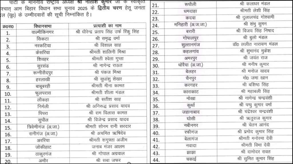 बिहार चुनाव 2025 को लेकर जनता दल यूनाइटेड (JDU) ने अपने 44 उम्मीदवारों की दूसरी सूची जारी कर दी है. इसके साथ ही नीतीश कुमार की पार्टी जेडीयू ने बिहार चुनाव को लेकर अपने पूरे 101 उम्मीदवारों के नामों की घोषणा कर दी है. मुख्यमंत्री नीतीश कुमार के नेतृत्व में जारी इस सूची में पार्टी ने सामाजिक संतुलन और क्षेत्रीय समीकरण को ध्यान में रखकर उम्मीदवार तय किए हैं.